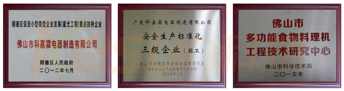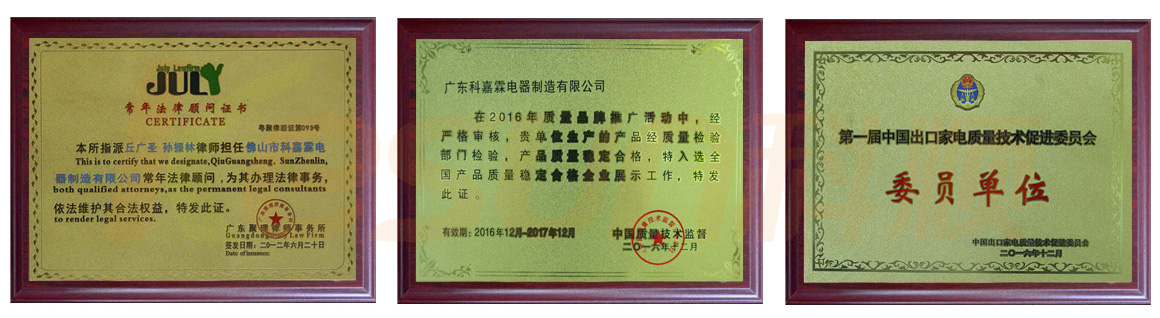 科嘉霖的光輝歲月,激情凝聚在沉實與開拓之中。科嘉霖產品先后通過ISO9001: 2015國際質量管理體系認證、3C認證、國際CE、GS、UL、CB、ETL、QA、EMC等權威認證,擁有先進的ERP管理系統。2009年廣東科嘉霖電器制造有限公司被廣東省科學技術廳授予“高新技術企業”榮譽稱號,2010年科順榨汁機獲得了“廣東省名牌產品”榮譽稱號。2015年,公司被政府授予了佛山市和順德區多功能食品料理機工程技術研究中心。2016年,授予了廣東省多功能食品料理機工程技術研究中心。科順電器以其新穎外觀、卓越品質、優質服務和高性價比,贏得廣大中外客戶的認可和厚愛。